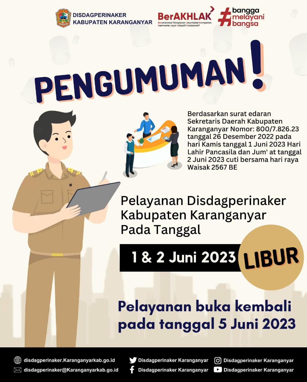 Pelayanan Disdagperinaker Kabupaten Karanganyar pada tanggal 1-2 Juni 2023 “TUTUP”.